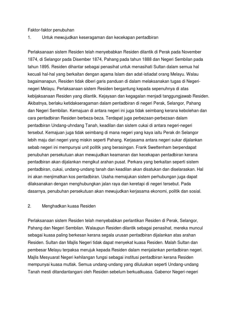 Residen tidak diberikan panduan jelas untuk menjalankan tugas. F6 Negeri-negeri Melayu Bersekutu juga dikenali sebagai Persekutuan 1896. Semoga perkongsian bahan-bahan rujukan panduan bahan pembelajaran dan pengajaran contoh-contoh karangan sumber rujukan PT3 Pentaksiran Tingkatan 3 tingkatan 1 tingkatan 2 tingkatan 3 dalam post di blog Bumi.